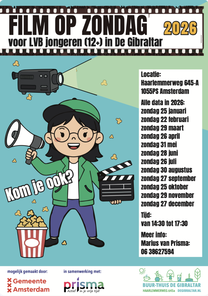 Wekelijkse samenkomst met elke 1e vrijdag van de maand film en elke 3e vrijdag van de maand een creatieve activiteit
